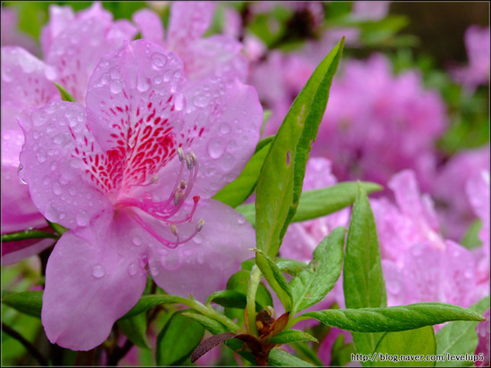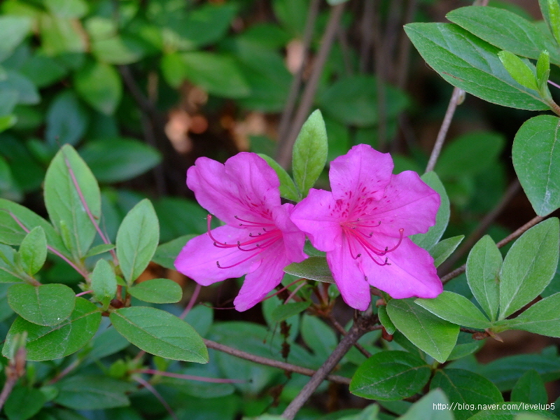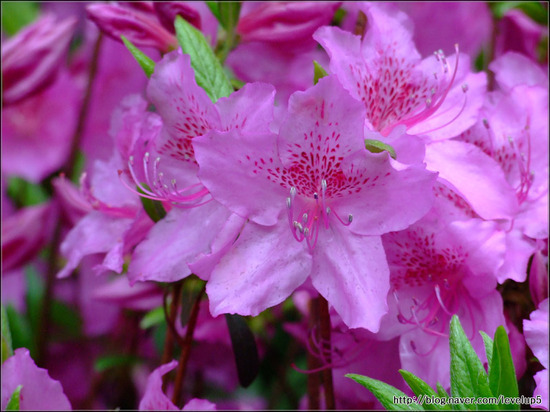 설명 : 일반 철쭉은 꽃잎이 옅은 분홍색에 점이 있고, 잎이 둥글하며, 산철쭉은 진한 분홍색에 잎이 뾰족하다