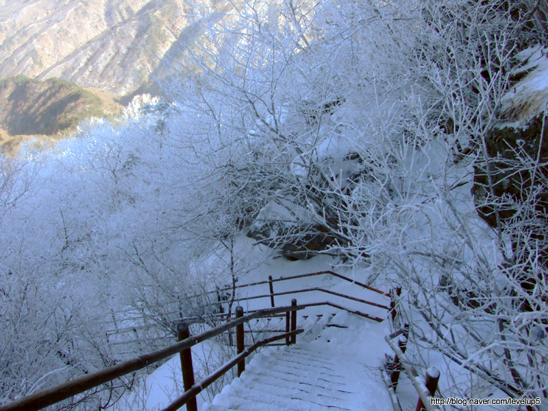 9시 31분 사다리병창에 도착하니 비로봉 주위의 하얀 상고대들이 눈에 들어 왔다.