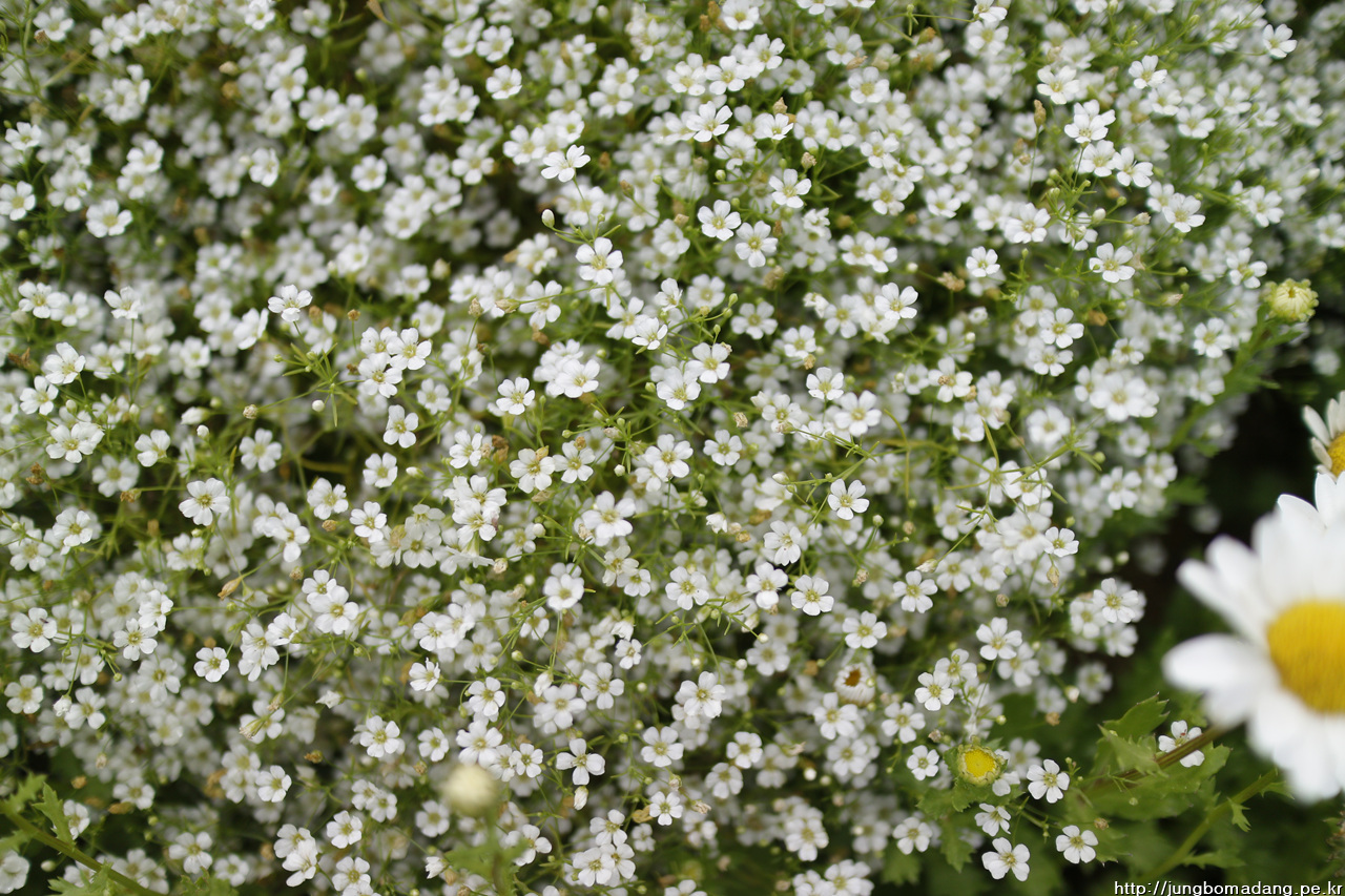 손으로 만든 빨간 장미 아래로 하얀 안개꽃과 마가렛