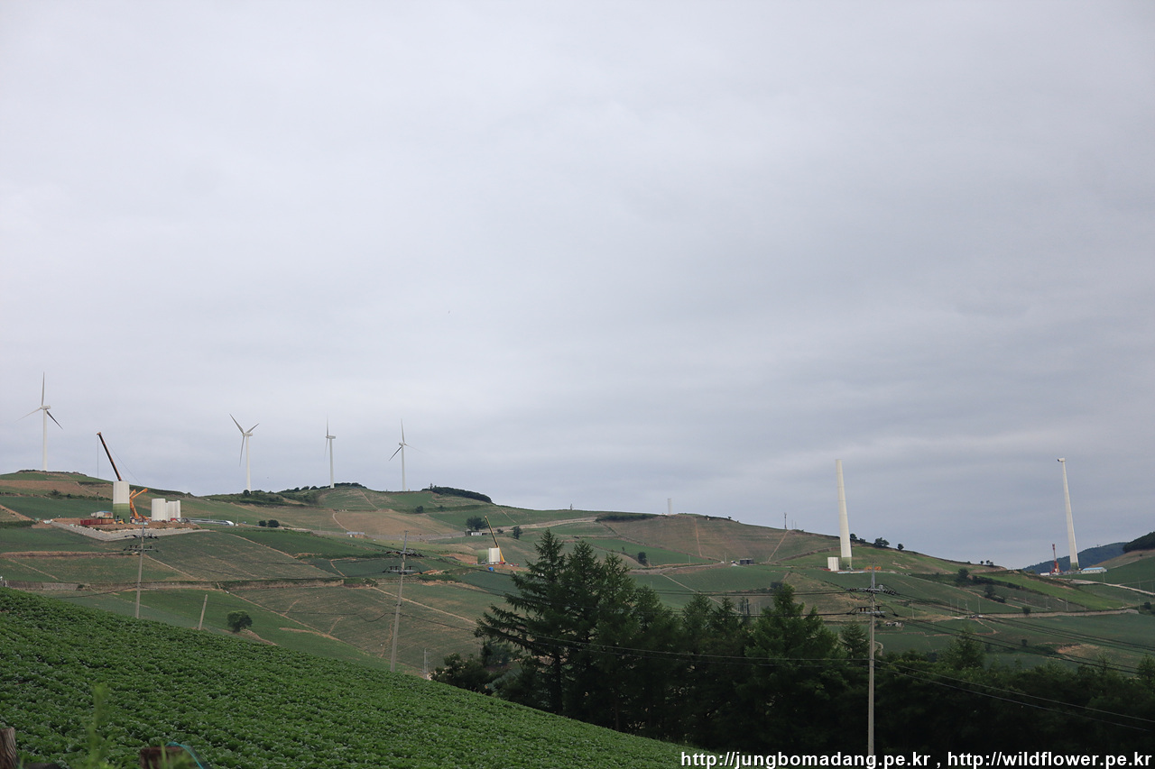고랭지 배추받에 선풍기들이 눈에 들어 옵니다. 열심히 전기를 생산 중이겠죠.