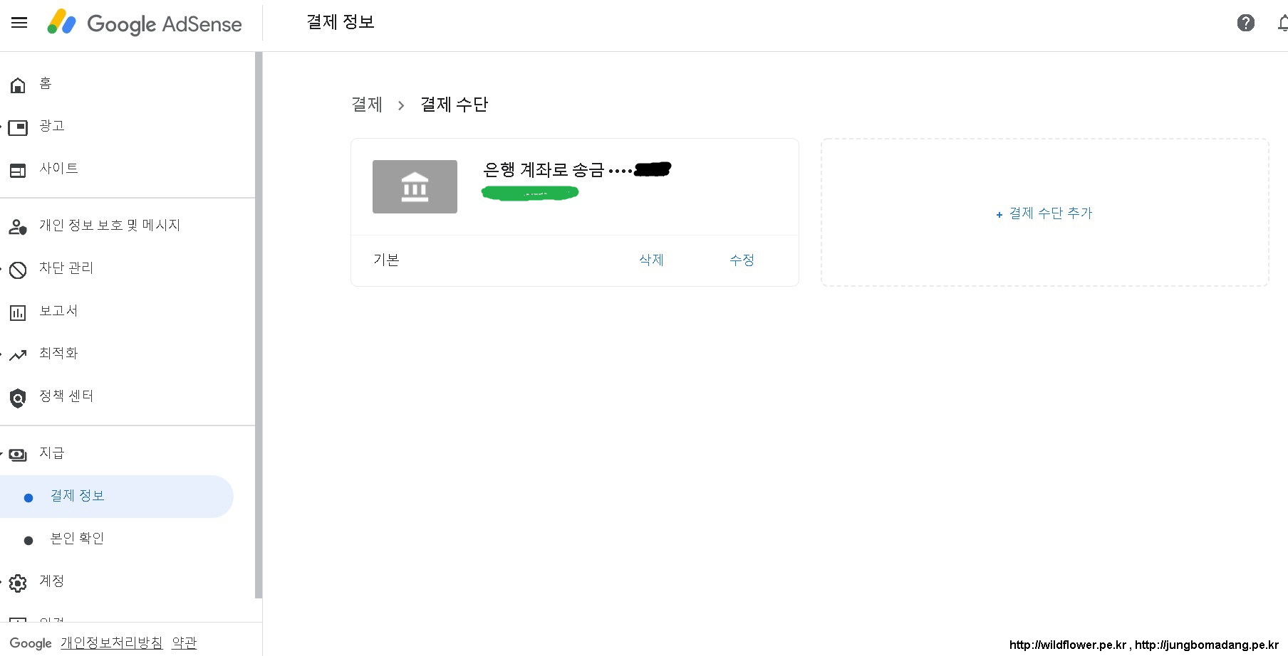 입력을 마치고 아래 저장 버튼을 누르면 아래와 같이 결제수단 등록이 되어 있습니다. 초록색 칠해둔 것은 영문 이름명, 검정색 칠해둔 것은 본인 계좌 뒤에 4자리 입니다.