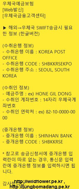 아래 보시다시피 작성해야되는 영문명이 기재되어 있습니다. 유심히 보셔야할 부분이 수취은행 이름, 수취은행 코드(SWIFT, 은행 식별 코드), 그리고 계좌가 한글이라 예금주 성명을 어떤식으로 표기해야 하는 지. 마지막으로 은행별로 다르지만 우체국의 경우 해외송금시 중계은행을 거치는 데, 중계은행 정보(중계은행 이름, 중계은행 코드(SWIFT, 은행 식별 코드)) 입니다.