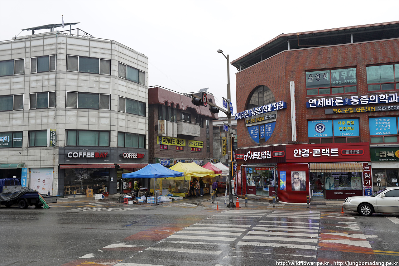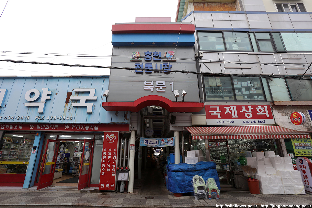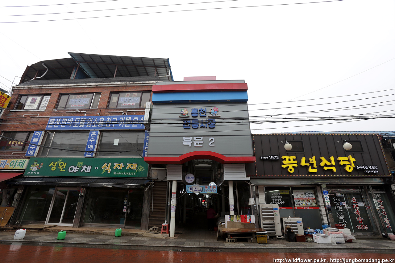 비가 아주 약하게 내리고 있는 상황. 걸어서 그리 멀지 않은 홍천전통시장으로 걸어 갑니다.