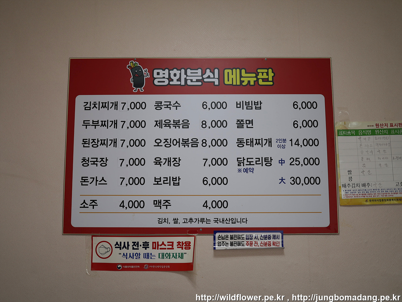 아무래도 밥 먹을 시간은 충분할 것 같아서, 식당 두 곳은 11시 30분 부터 영업 한다고 해서 실패하고, 세번째 도전한 명화분식집에서 식사 된다고 해서 쫄면, 물냉면(메뉴판에는 없지만 6000원) 두개를 주문하니 여사장님이 잠시 멈칫 ㅋㅋㅋ