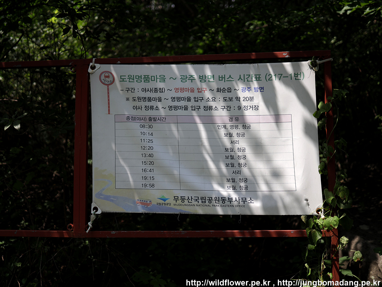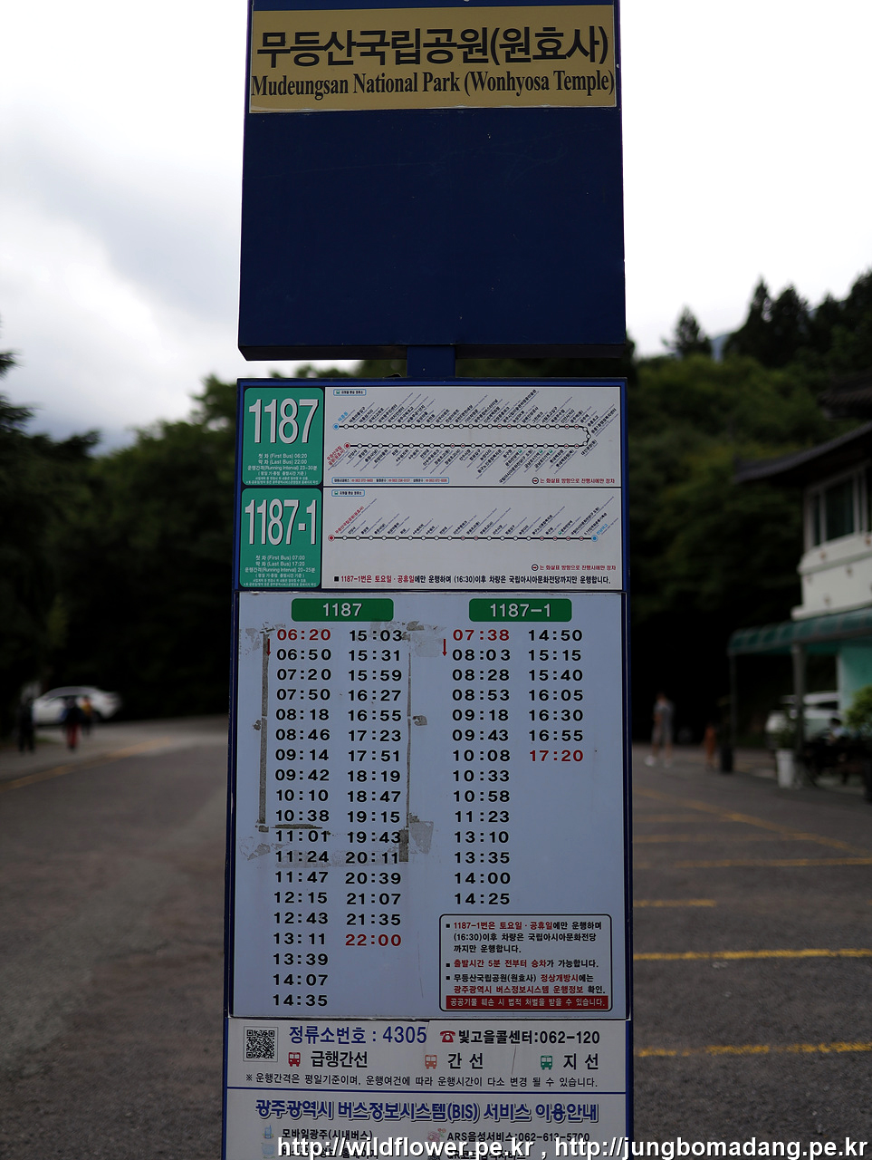 1187번 버스를 타면 무등산 원효사 코스에서 시계 반대 방향으로 한바퀴 진행하고 증심사에서 마무리합니다.