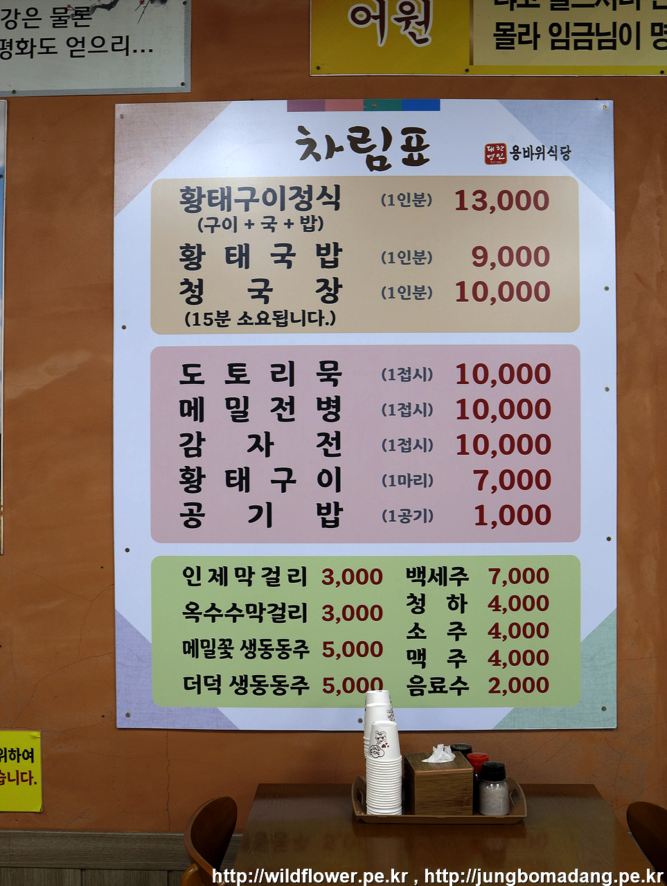용바위식당 메뉴판 황태구이 정식과 메밀전병 그리고 감자전, 막걸리를 주문합니다. 메밀전병은 약간 매콤합니다.