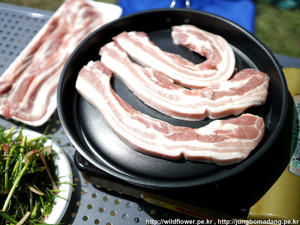 텃밭에서 고추를 따 오는 시간, 삼겹살이 익어 갑니다.