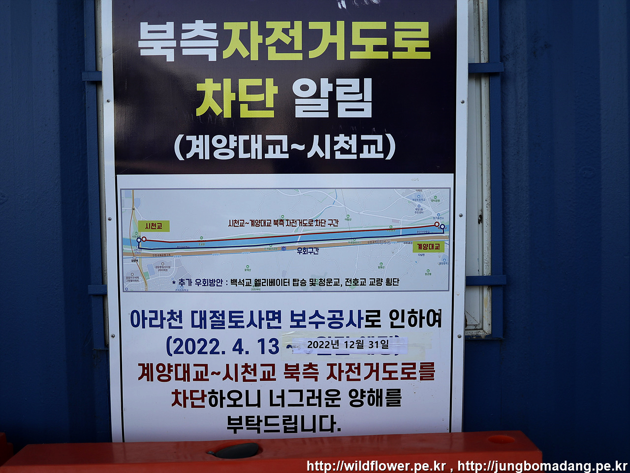 그런데 말입니다? 실컷 엘리베이터 타고 계양대교를 넘어 갔더니 진행방향이 공사중이라고 합니다. 이런 건 다리 건너편에도 안내가 되었으면 하는 아쉬움이 있었습니다. 그렇게 길 찾는다고 20분 헤매이다 결국 다시 계양대교 원래 위치로 되돌아 건너고,