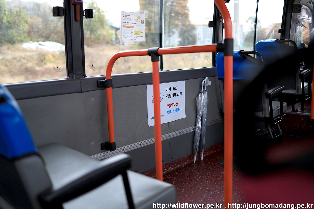5번 공영버스를 타고 반계리 은행나무를 만나러 가는 길. 30분 정도 후에 남도동 정류장에서 하차하면 됩니다. 깨알같이 행복우산이 비치된 것을 찰칵! 비오는 데 깜빡하고 우산 안 챙겨 오신 분들에게는 희소식이죠.