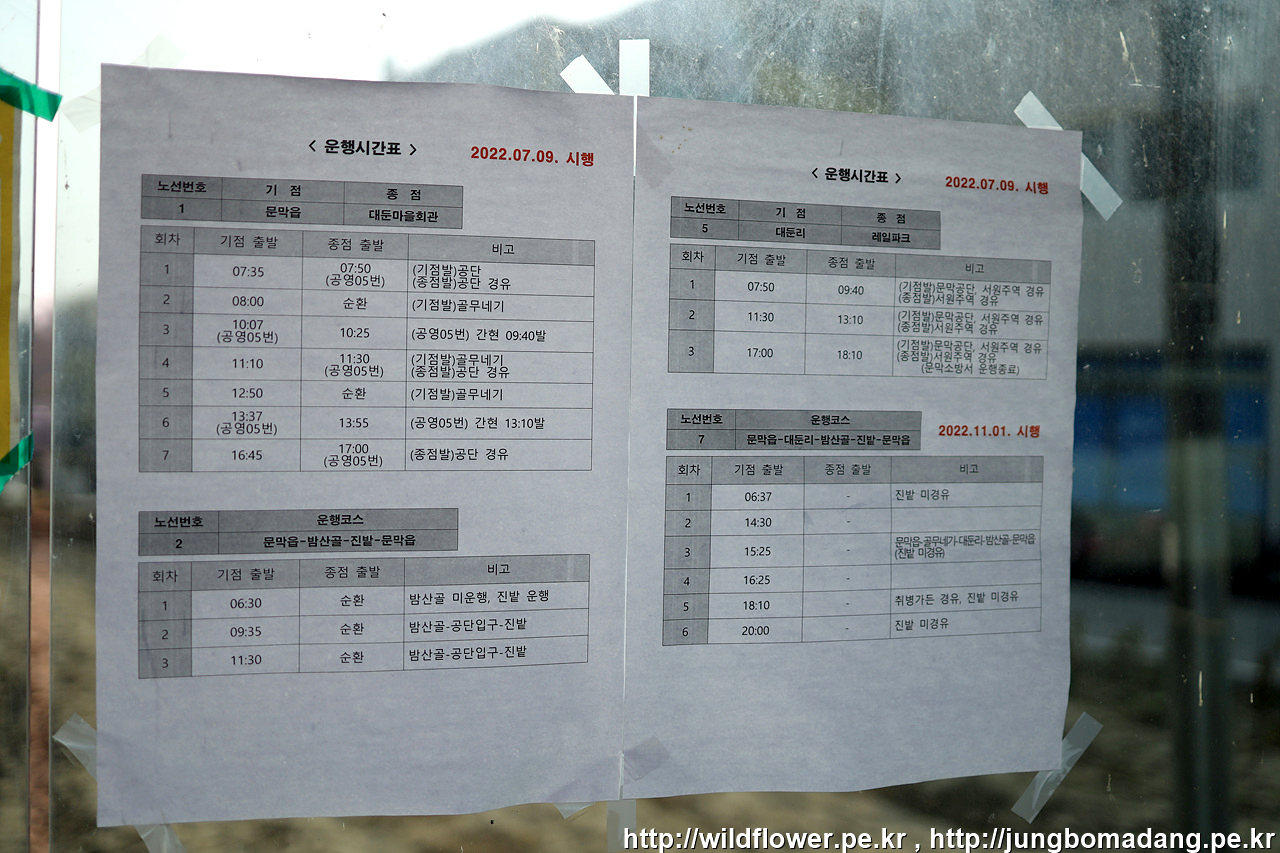 서원주역으로 가실 분은 5번 공영버스 시간표(우측 상단)를 참고하시면 됩니다. 기점은 대둔마을회관, 종점은 레일파크를 의미합니다.