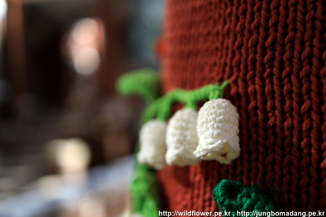 나무 줄기를 감싼 실뜨개가 따뜻하게 느껴집니다.