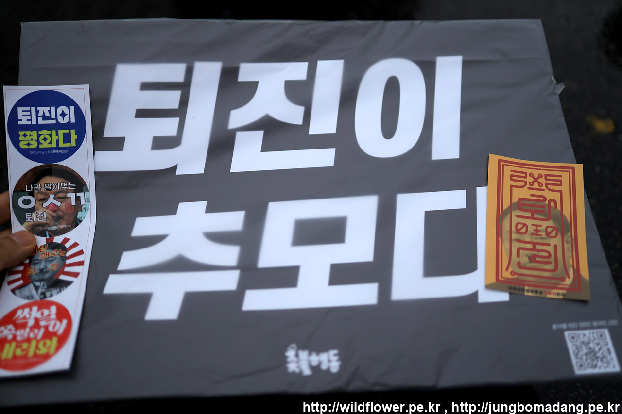 아직 비가 본격적으로 내리지 않지만, 피켓을 비닐로 씌워서 주시네요. 다른날 보다 더 고생이 많으신 것 같습니다. 그와 더불어 스티커와 퇴진 부적도 나눠 주십니다.