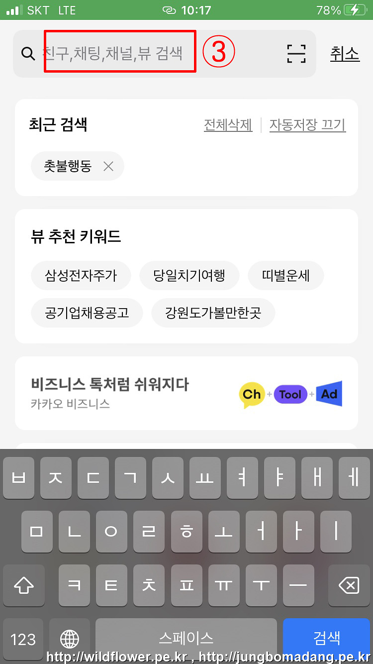 검색란(③)을 터치 하시면 자판이 나오는 데,