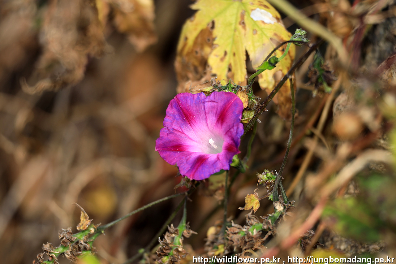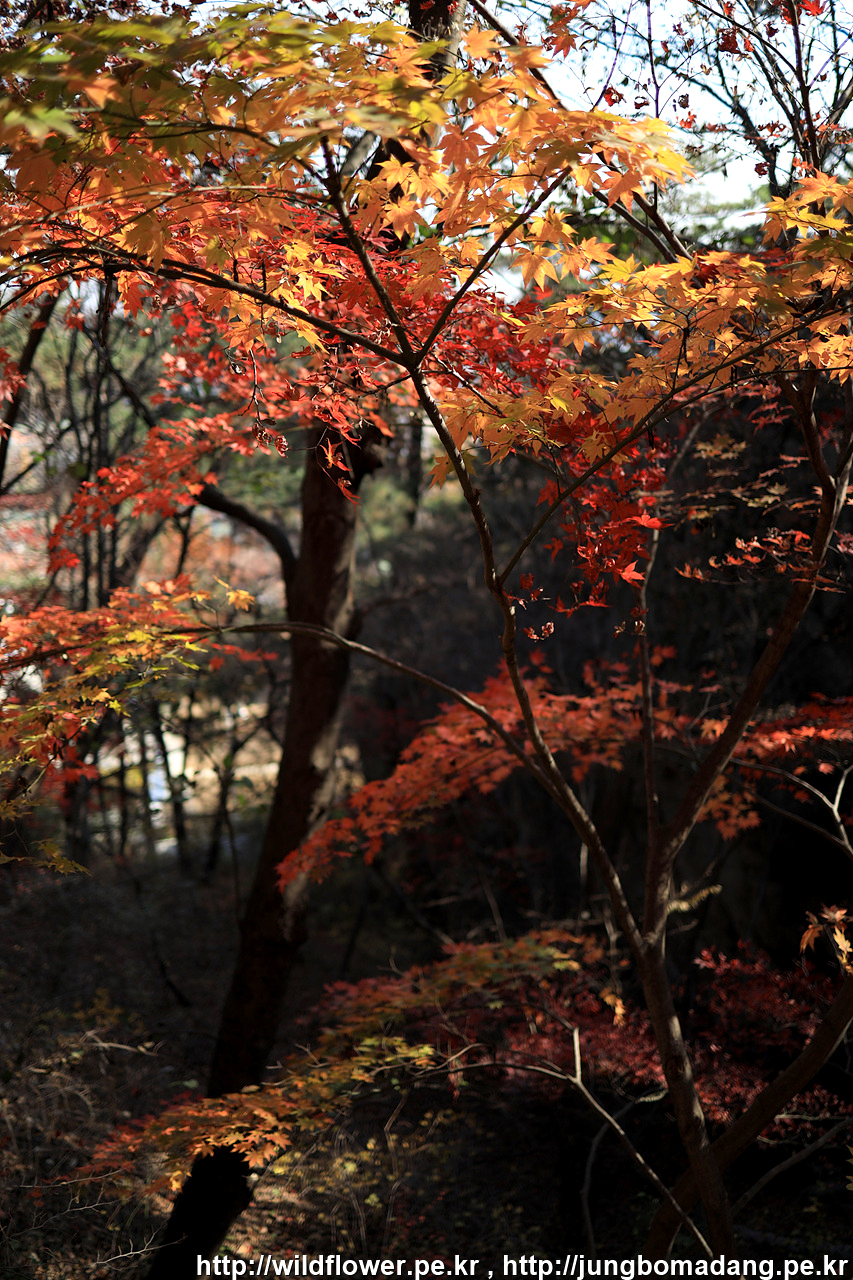 절정을 지나 떨어진 잎이 많은 단풍나무 숲을 지나고 있습니다.