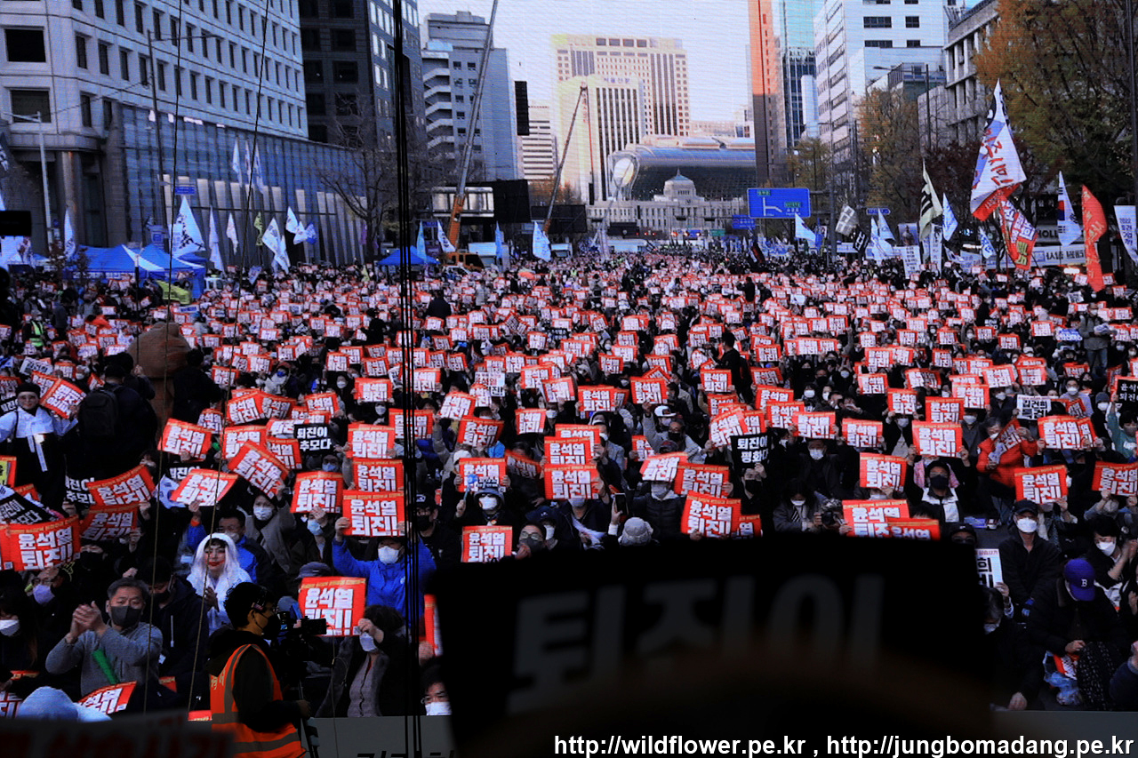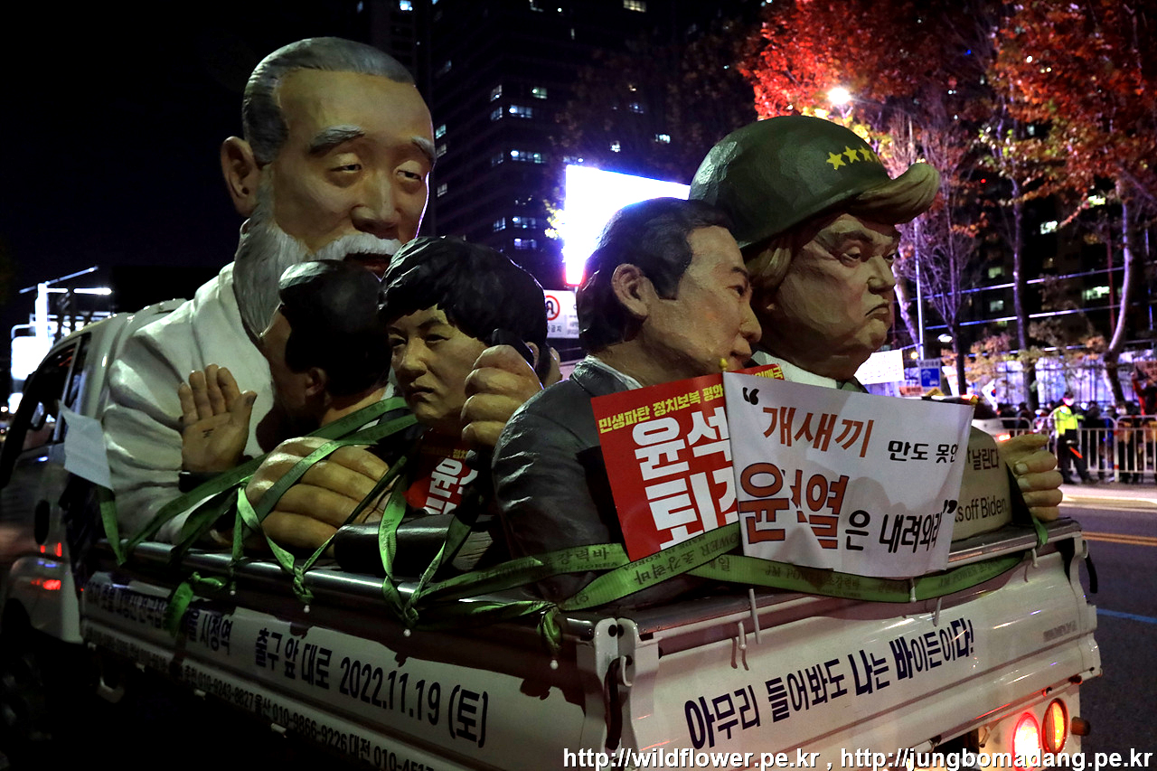 인터넷을 통해 자주 뵈었던 트럭도 보입니다. 정말 잘 만드셨습니다. 윤석열을 하도 시민들이 떄려서 망가져서 아예 윤석열 모가지가 돌아가게 만들었다는 말씀을 해주셨네요.