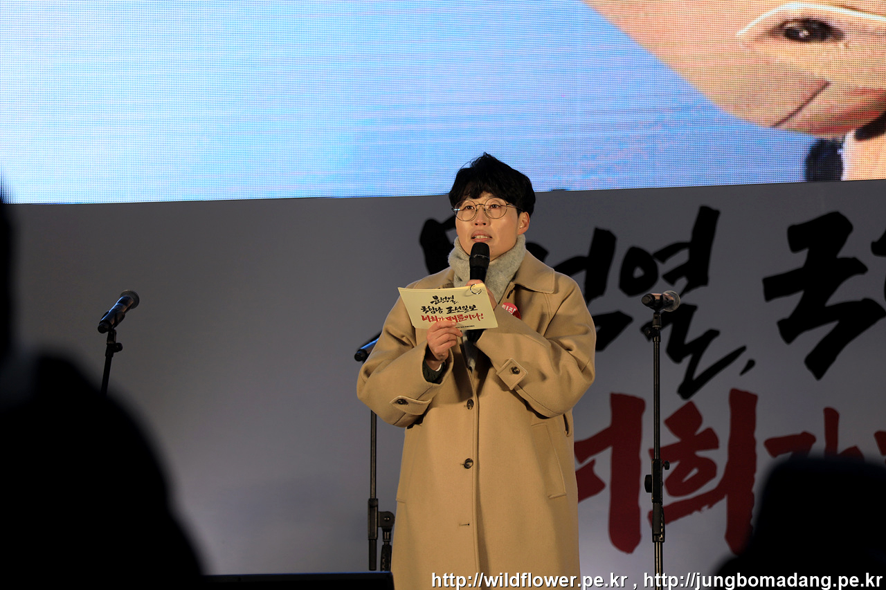 곧바로 행진이 있을 예정이고, 본집회는 시청이라 행진 차량에서 촛불행동 권오혁 사무국장님이 안내를 하고 있습니다.