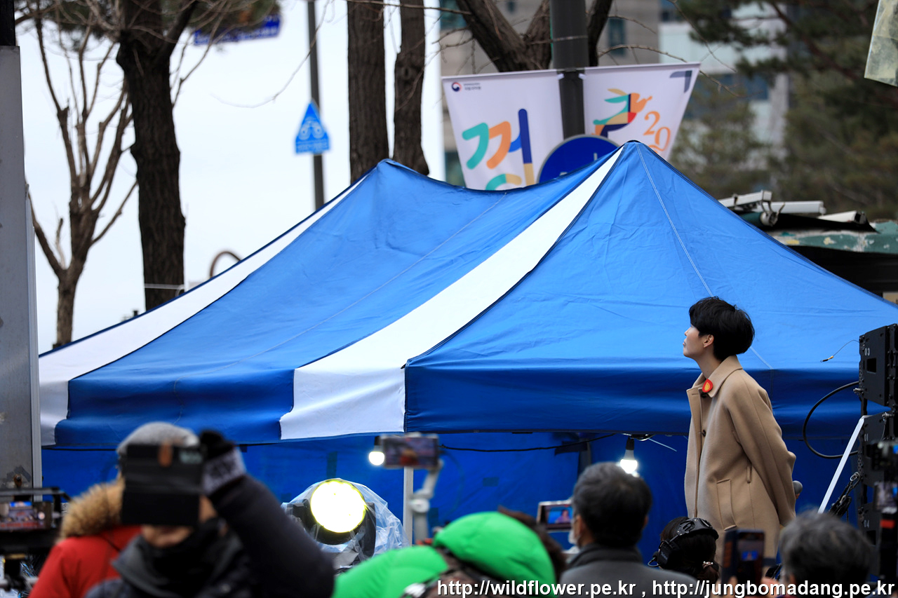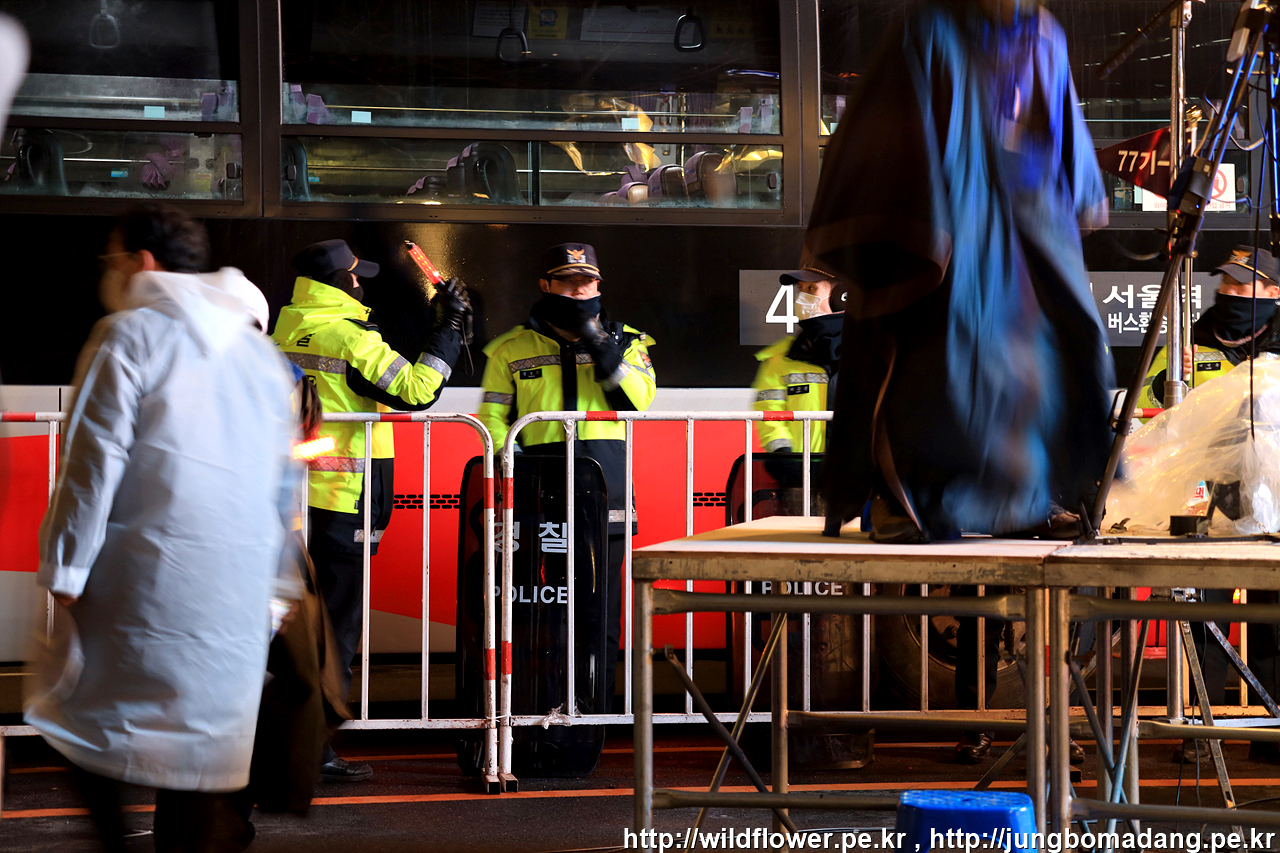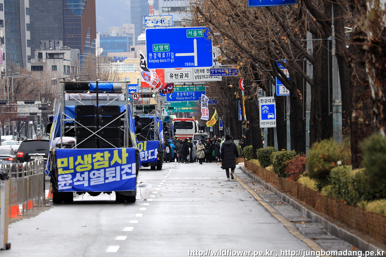 삼각지역 11번 출구에서 약 300M 정도 되는 공간 2차로 정도 확보가 되어 있습니다. 극우들 시위대와 충돌을 방지하기 위해 차단벽이 삼중으로 설치되어 있습니다.