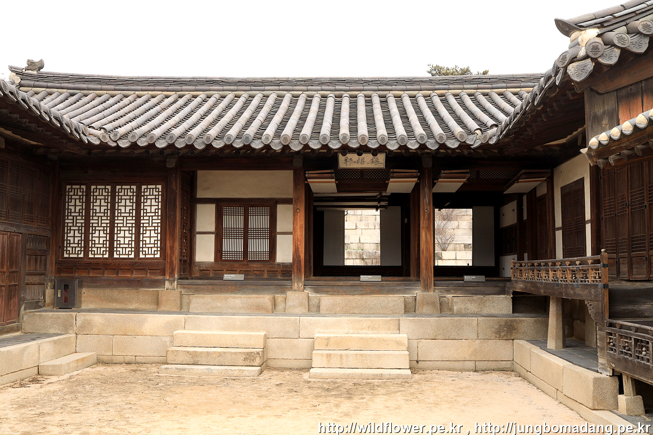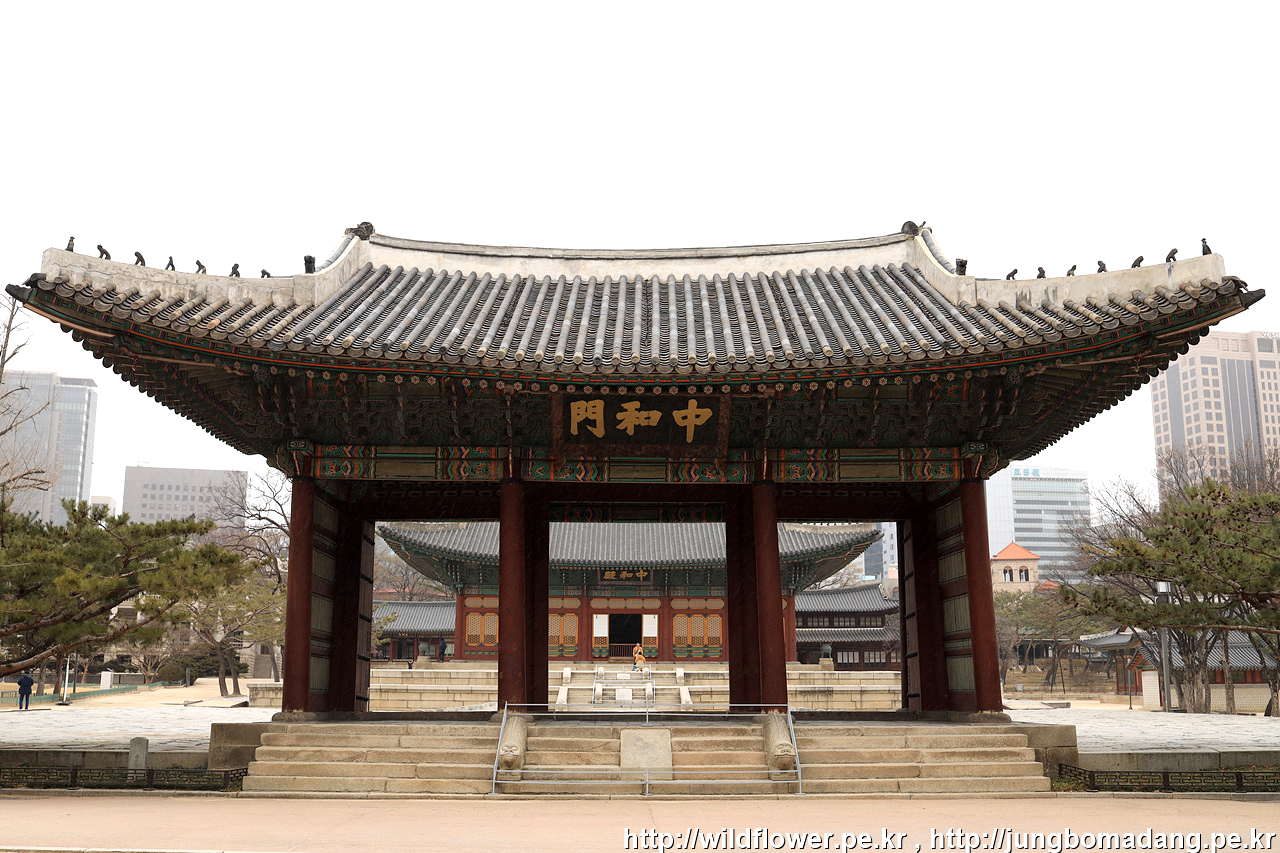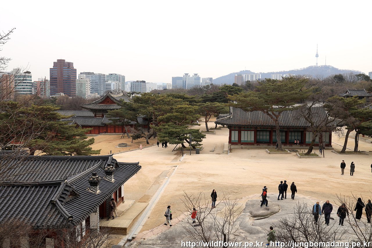 덕홍전(좌), 중화전(중), 살구나무(중), 석어당(우) - 석어당 앞에는 오래된 살구나무가 심어져 있습니다.