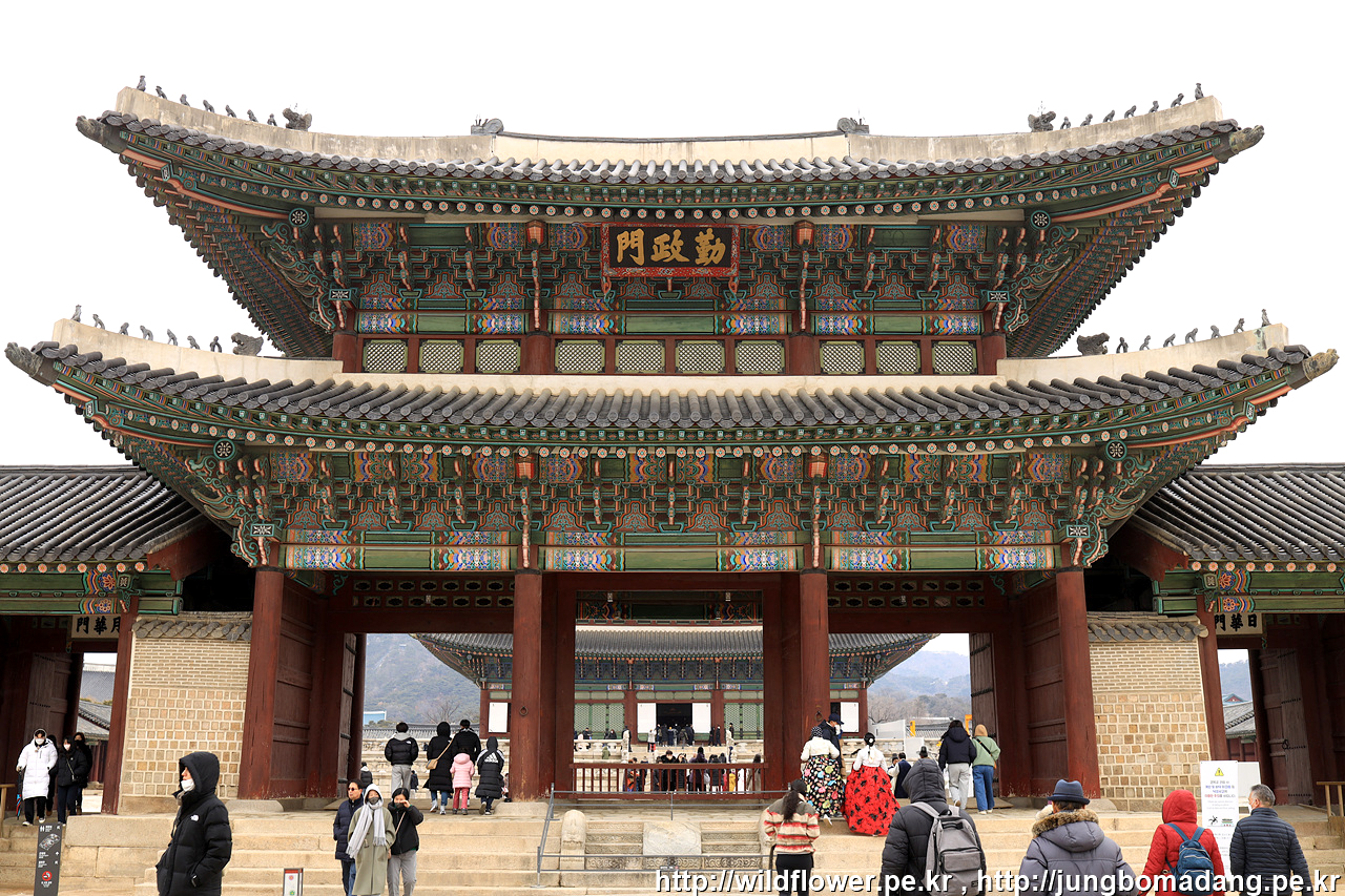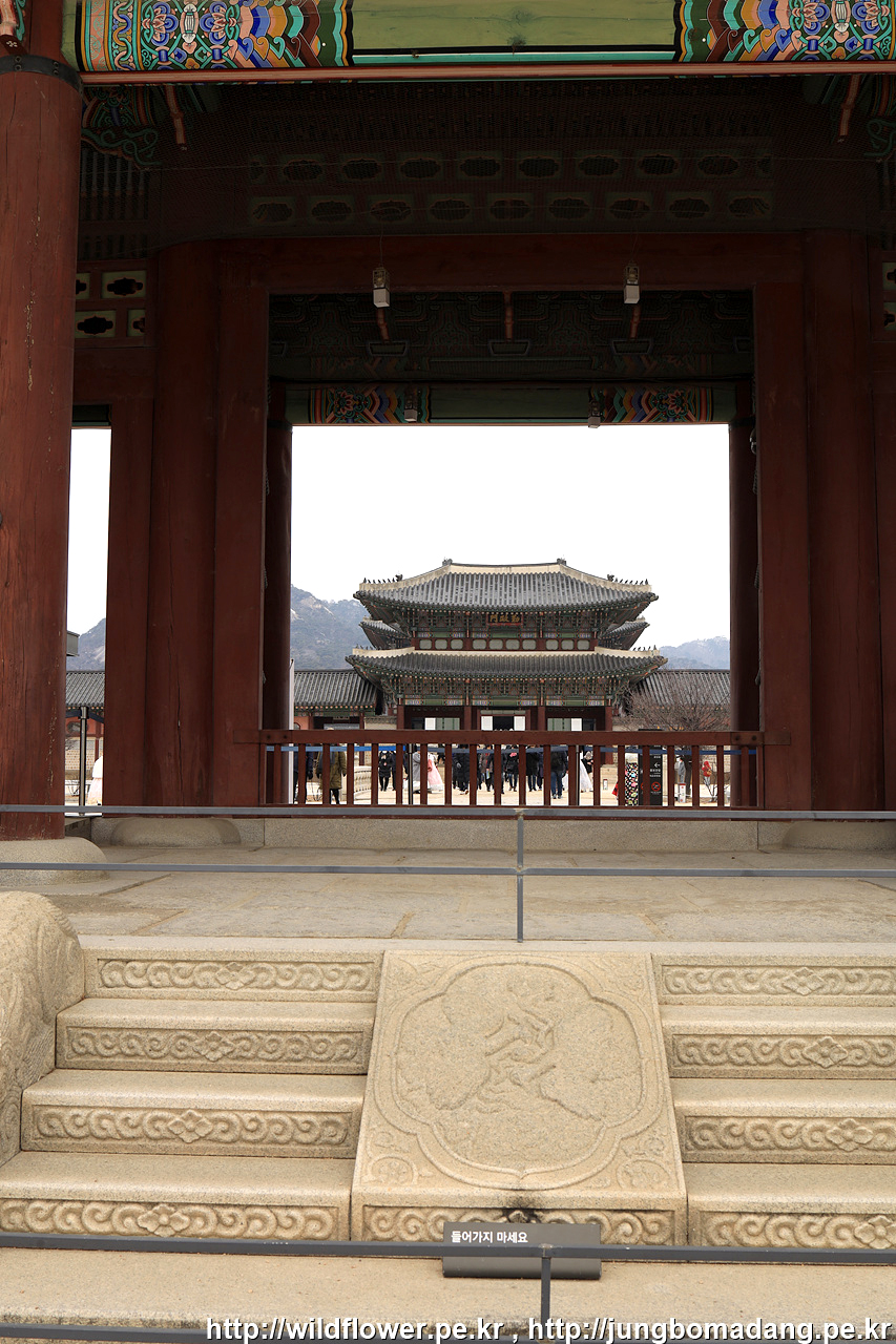 숭정문 - 흥화문 부터 숭정문까지 야외 구간은 평소에도 무료로 개방되어 산책등 가능한 곳이고, 숭정문 안쪽부터는 유료로 입장이 됩니다. 하지만, 오늘은 명절 무료 개방!. 답도가 보입니다. 답도는 임금 행차시 어가(임금 가마)가 지나가는 자리로 봉황이 그려져 있어 태평성대를 바라는 맘이 새겨져 있습니다. 단, 5대 궁궐중 덕수궁의 답도는 봉황이 아닌 용이 새겨 있는 데, 이는 대한제국인 황제국을 의미합니다.