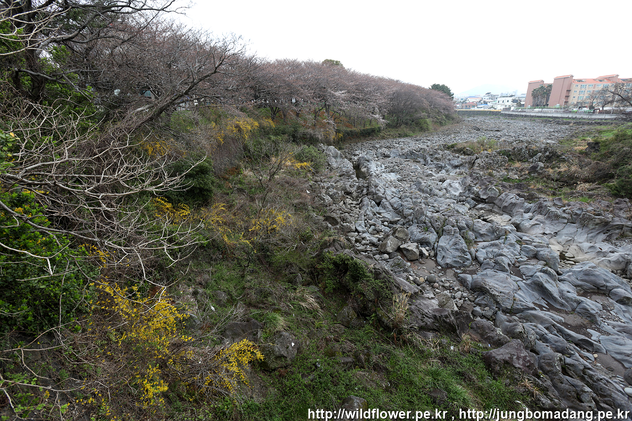 한천 - 개나리(좌측 아래), 벚꽃(좌측 - 일부 개화)