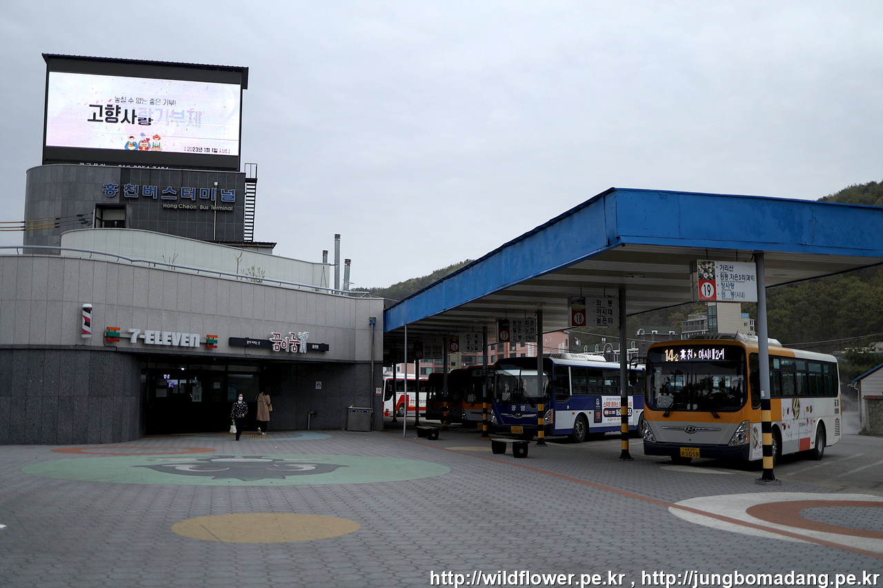 홍천 터미널 모습 - 오른편에 보이는 버스는 시내버스들이고 안쪽으로 더 들어가면 동서울 등 시외버스를 타는 곳입니다.