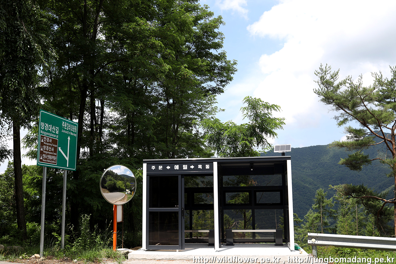 버스가 35분 후 주문리종점(모운동)에 도착합니다. 시간을 아끼기 위해 아래 에밀 정류장까지 가야하는 데, 10시 50분에 타고온 버스가 지나가므로 잠시 승차 대기했다가, 기사님 출발 시 버스 카드를 다시 찍는 지 문의하니 이어서 가는 거라 그런 지 안찍어도 된다고 해서 출발 후 싸리재 정류장 다음인 예밀 정류장에서 하차합니다. 주문리종점(모운동)에서 예일정류장까지는 버스로 약 6~7분 소요됩니다. 아래 사진은 주문리종점에서 대기시 잠시 내려서 찍은 것입니다. 예밀정류장에서 굽이길을 지나 망경산사에 들리고, 만경사길을 통해 만경사를 다녀온 후 낙엽송삼거리에서 명상길, 광부의길 2구간을 통해 운탄삼거리에서 흰색 라인을 따라 현위치인 주문리종점(모운동)까지 되돌아 오는 여정입니다. 제 기준으로 쉬는시간 50분 포함하여 7.5Km 약 3시간 40분 소요되었습니다. 참고로 영월 시내로 되돌아 가는 버스는 14시 50분에 주문리종점(모운동)에서 출발하여 3시간 56분 정도 시간이 필요하므로 시간이 빡빡하다 생각되면 명상길, 광부의길 2구간을 포기하고 여유있게 굽이길, 만경사길만 이용하여 원점회귀하여 예밀정류장에서 영월로 복귀하는 방법도 참고하시길 바랍니다.