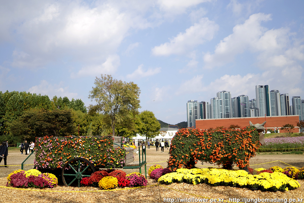 수레를 끄는 소를 국화로 장식하여 만들었네요.