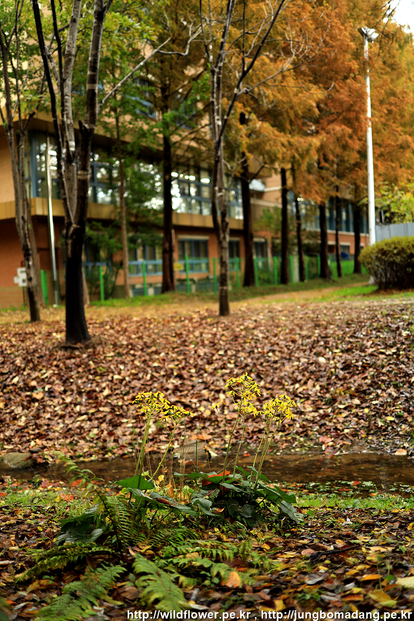 털머위. 근데 갑자기 후두두둑! 빗방울이 떨어지기 시작합니다. 우산을 미처 준비하지 못해서 잠시 나무 아래 피신을 하다가 도저히 안되겠어서 근처 비를 피할만한 지붕있는 쉼터로 몸을 피합니다.