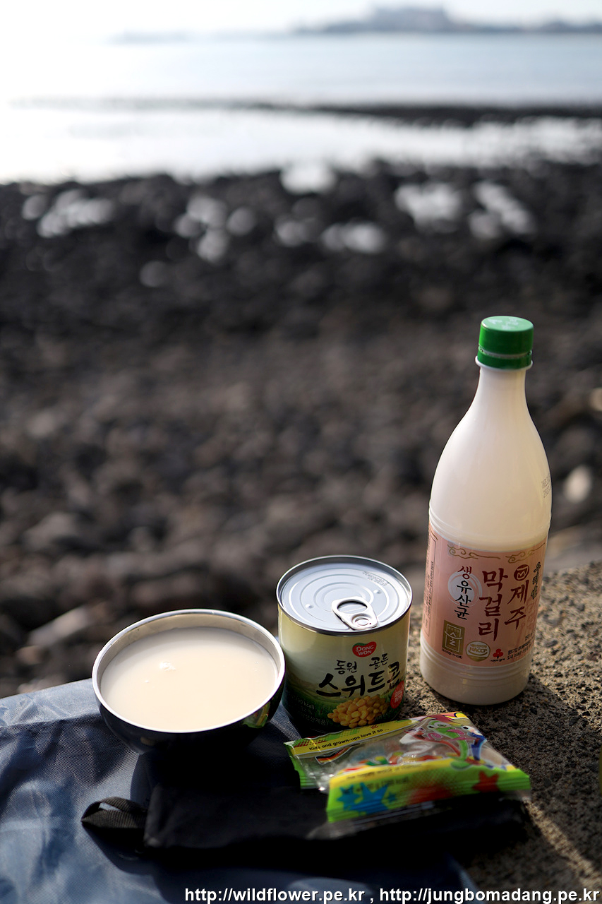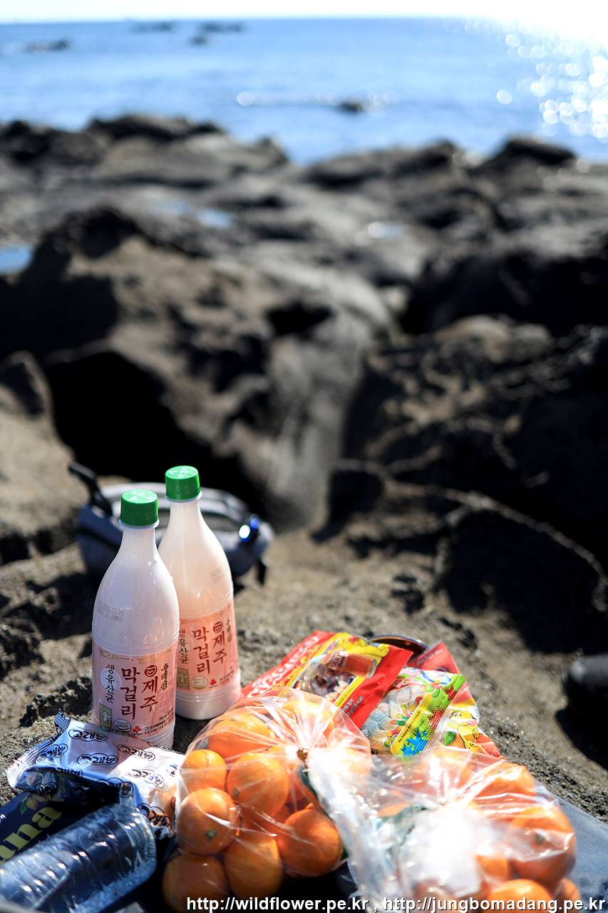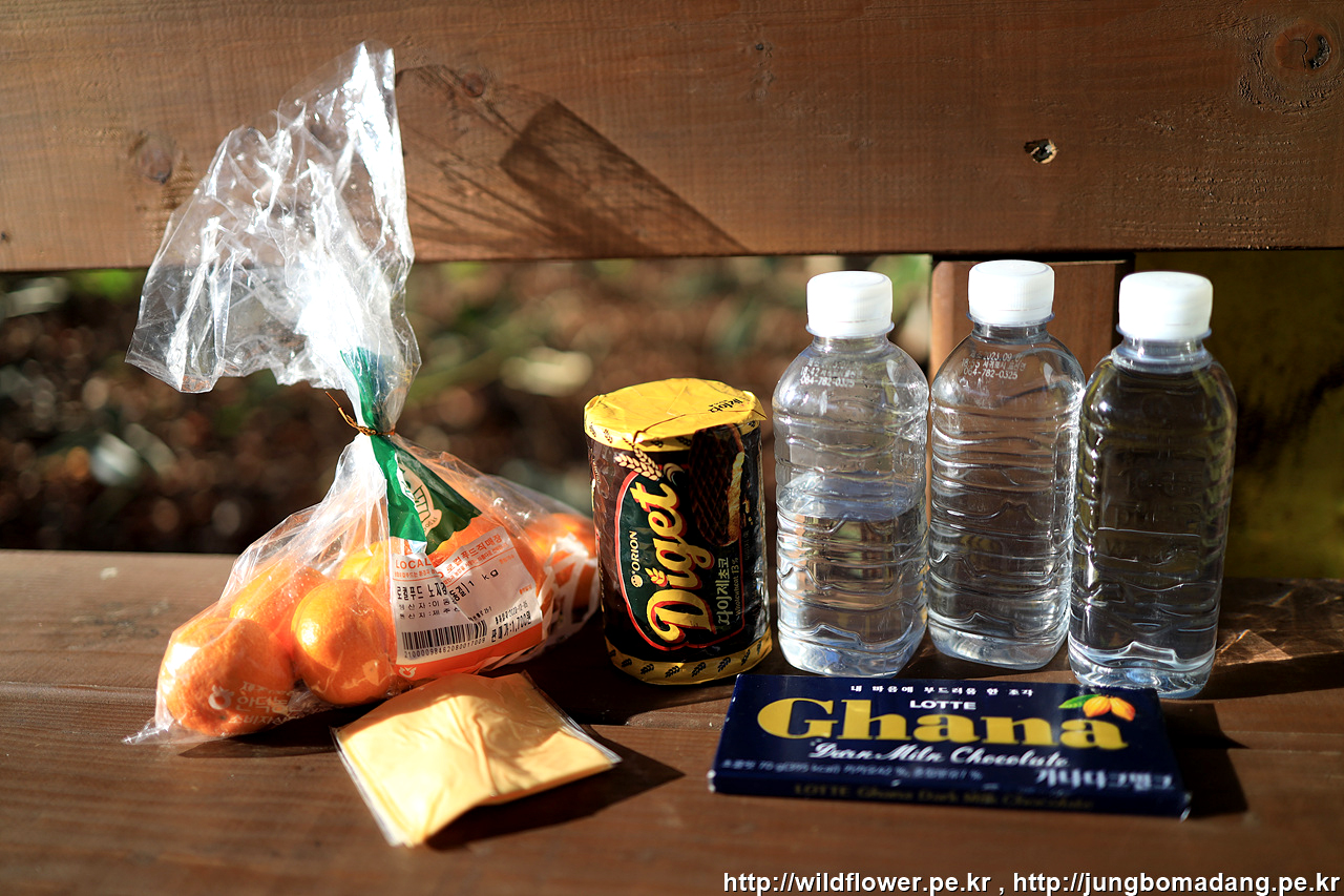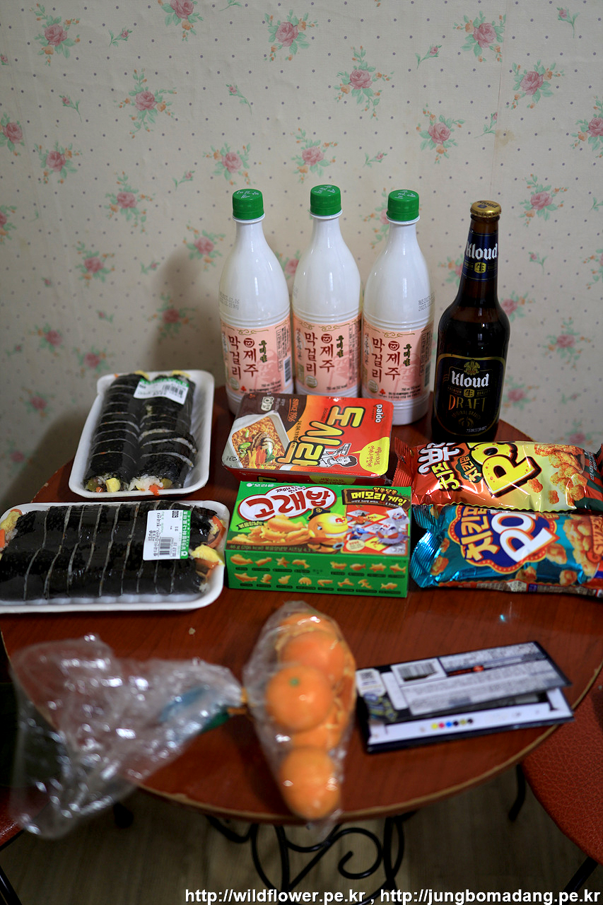 하나로마트에서 구매한 귤과 막걸리 그리고 집에서 챙겨온 간식들...