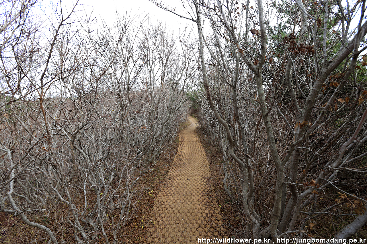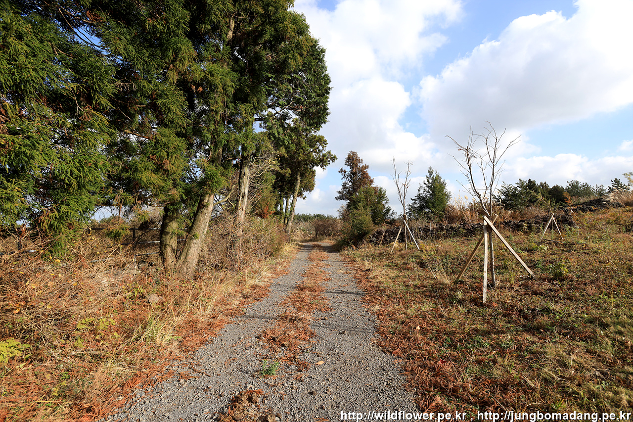 중간에 좌측편으로 나무가 심어진 경사가 시작되는 곳이 오름 내려가는 곳과 이어지는 삼거리 입니다.