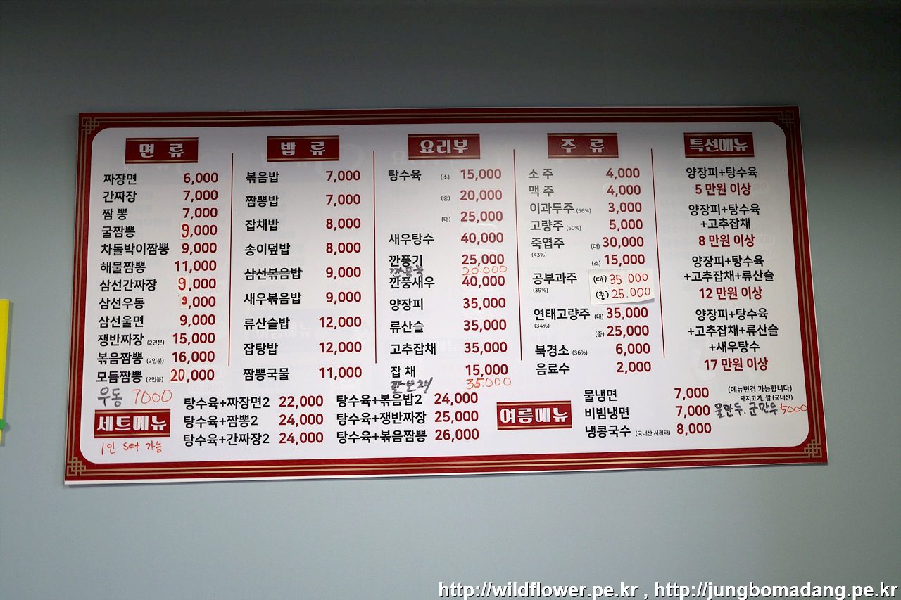 메뉴판 - 한쪽 구석에 조용히 적혀 있는 1인 Set 가능 - 탕수육과 만두(2개)에 만원 그리고 음식(간짜장을 고르면 7천원)을 고르면 된다고 하여 간짜장 버전으로 주문합니다. 17000원.