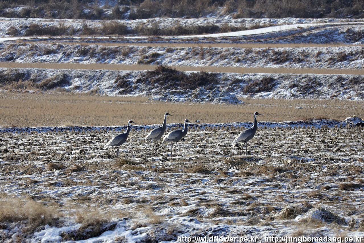 재두루미 - 성조, 새끼 2마리, 성조 : 보통 1~2마리의 새끼로 구성된 4마리의 완전체 가족입니다.
