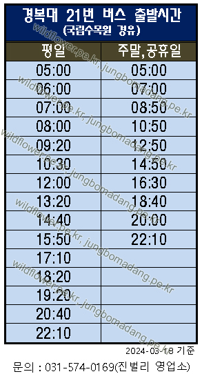 3개월 전 광릉요강꽃 개화 상황을 보기 위해 진접역을 경유해서 21번 버스를 타고 국립수목원으로 방문했는 데, 이번에는 회차지점인 의정부 쪽에서 21번 버스를 타고 국립수목원을 방문해 보기로 합니다. 아래 시간표 출발 기준으로 의정부역.흥선지하도입구(정류장ID:08413)까지 약 1시간 정도 소요되므로 참고 하시길 바랍니다.