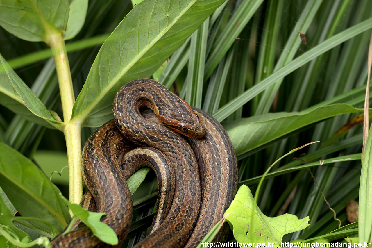 물뱀(무자치) - 물가장자리 풀더미 위로 뱀 한마리가 똬리를 틀고 있네요.