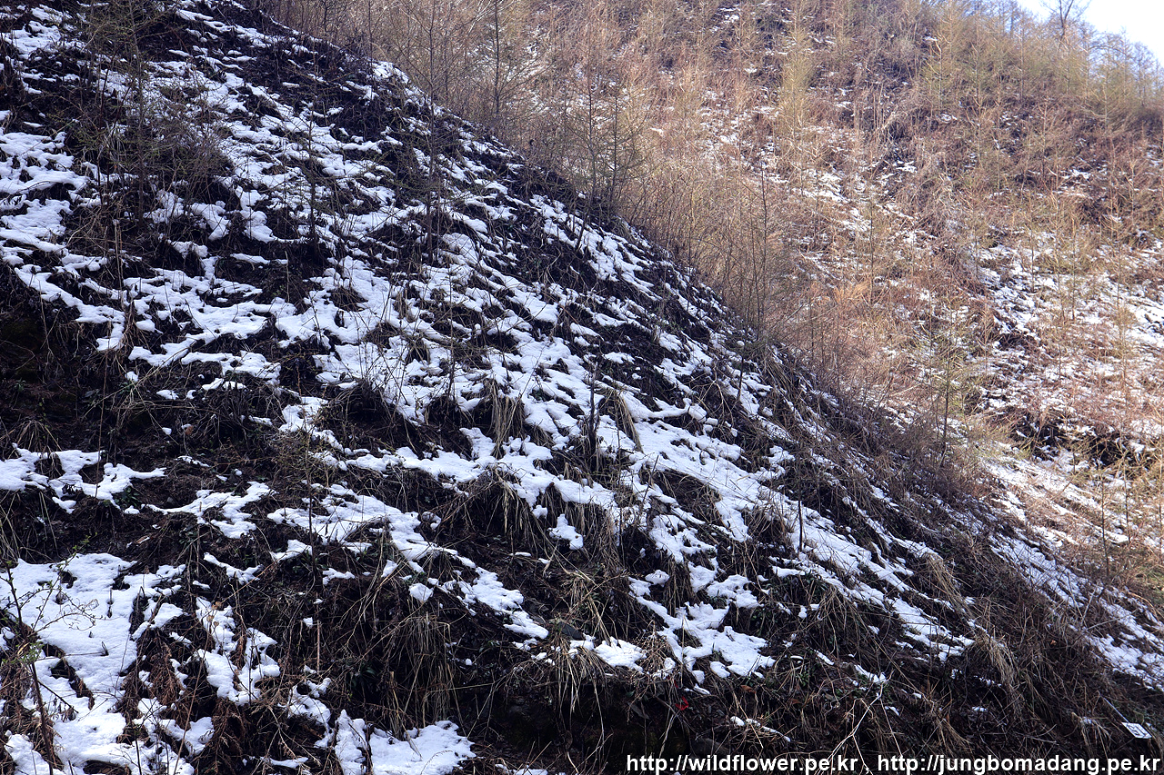 한계령풀 자생지에 도착했는 데, 역시나 눈이 쌓여 있어 야생화들이 시들 시들합니다.