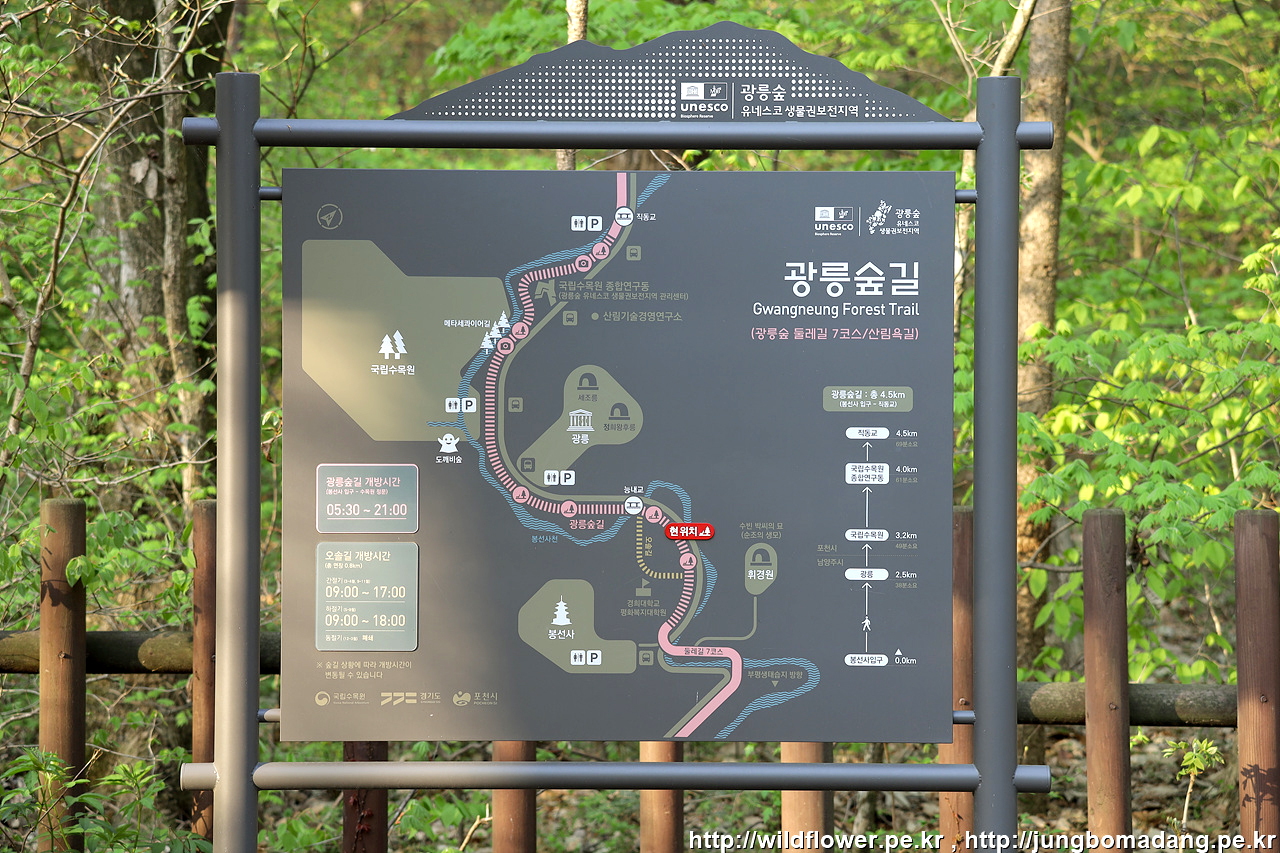 오남역 3번 출구에서 2, 2A, 2-2, 2-2A 버스를 이용하여 봉선사입구에서 하차 후 광릉숲길을 이용하여 국립수목원까지 35분(2.3Km) 걸어서 이동하는 방법을 이용했습니다.