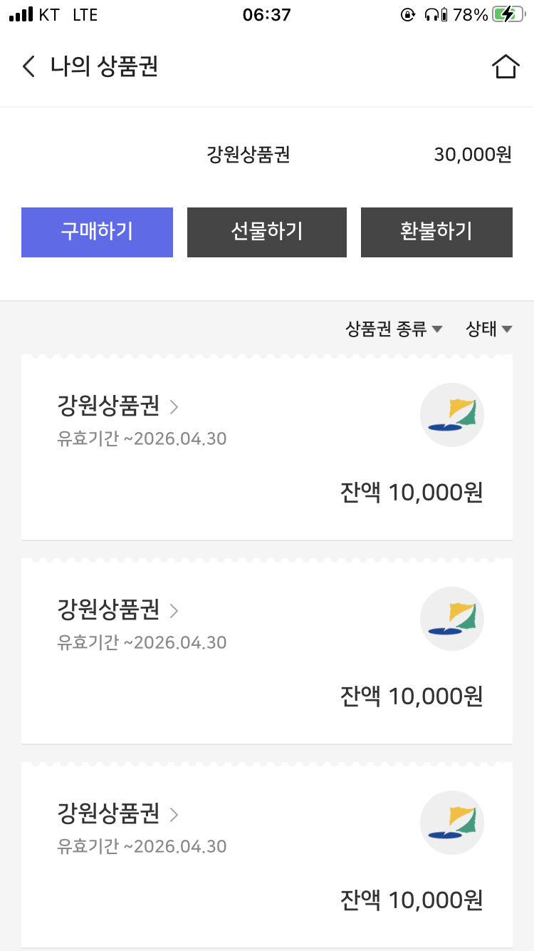 이번엔 좀 더 합리적인 소비를 위해 제로페이를 충전해 갑니다. 제로페이는 보통 서울에서만 사용하는 걸로 아는 데, 다른 지역도 그 곳 상품권이 있으면 지원합니다. 홍천에서 사용 가능한 상품권을 찾아보니 강원사랑상품권을 구매하면 되네요. 그렇게 10% 할인 해서 3만원 충전에 27000원만 지불합니다.