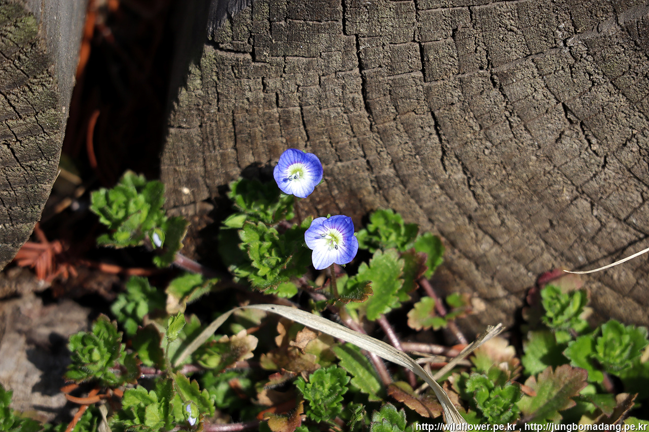 봄까치꽃 - 다른 이름으로 큰개불알풀이라고 하는 데, 이는 열매가 개의 불알 모양 같다고 붙은 이름입니다. 꽃말은 기쁜소식입니다. 큰개불알풀은 어감이 별로 안좋으니 봄까치꽃이라고 불러주는 게 좋겠습니다.
