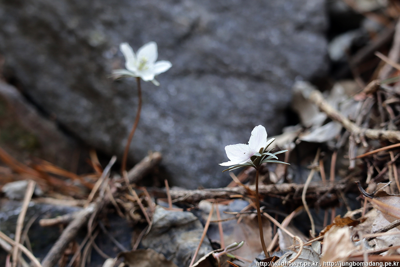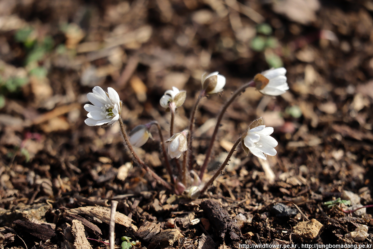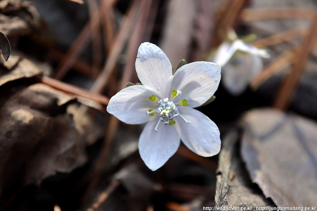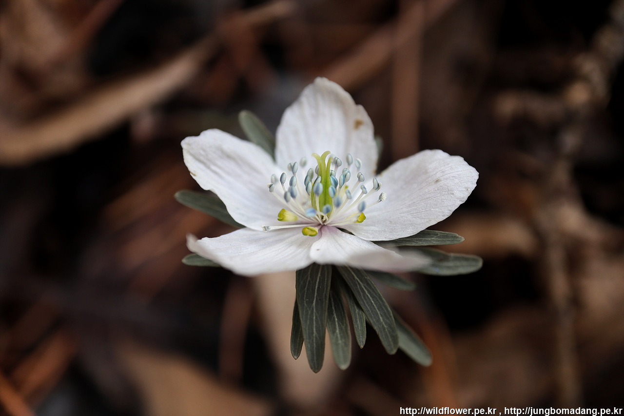 변산바람꽃 - 하얀 꽃잎 같은 5장은 꽃이 아니고 허꽃(가짜꽃)으로 곤충들을 유인하는 기능을 지녔습니다. 진짜 꽃은 가운데 연두색 깔대기 모양입니다.