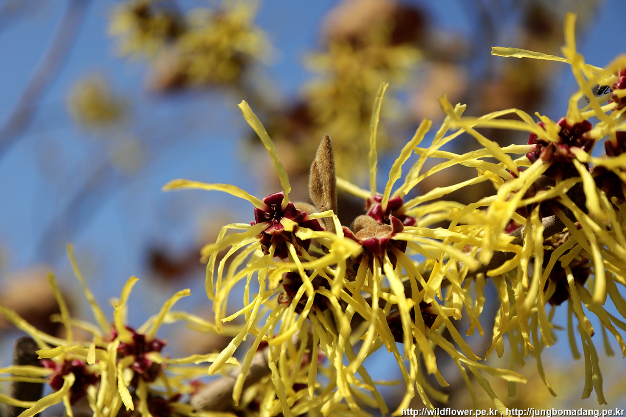 몰리스풍년화 - 풍년화보다 꽃잎이 두배정도 길고 원산지가 풍년화는 일본인데 비해, 몰리스풍년화 원산지는 중국입니다. 꽃말이 풍년화의 사랑, 정성에 추가로 저주, 악령도 추가됩니다. 꽃 향기는 풍년화와 같습니다.