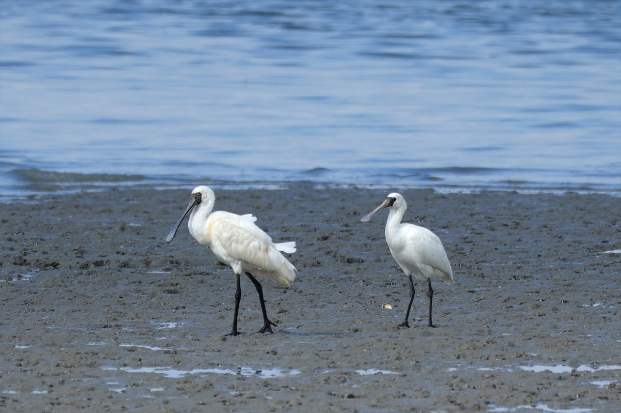 갯벌이 드러나기 시작하니 저어새들이 먹이 활동을 시작합니다.