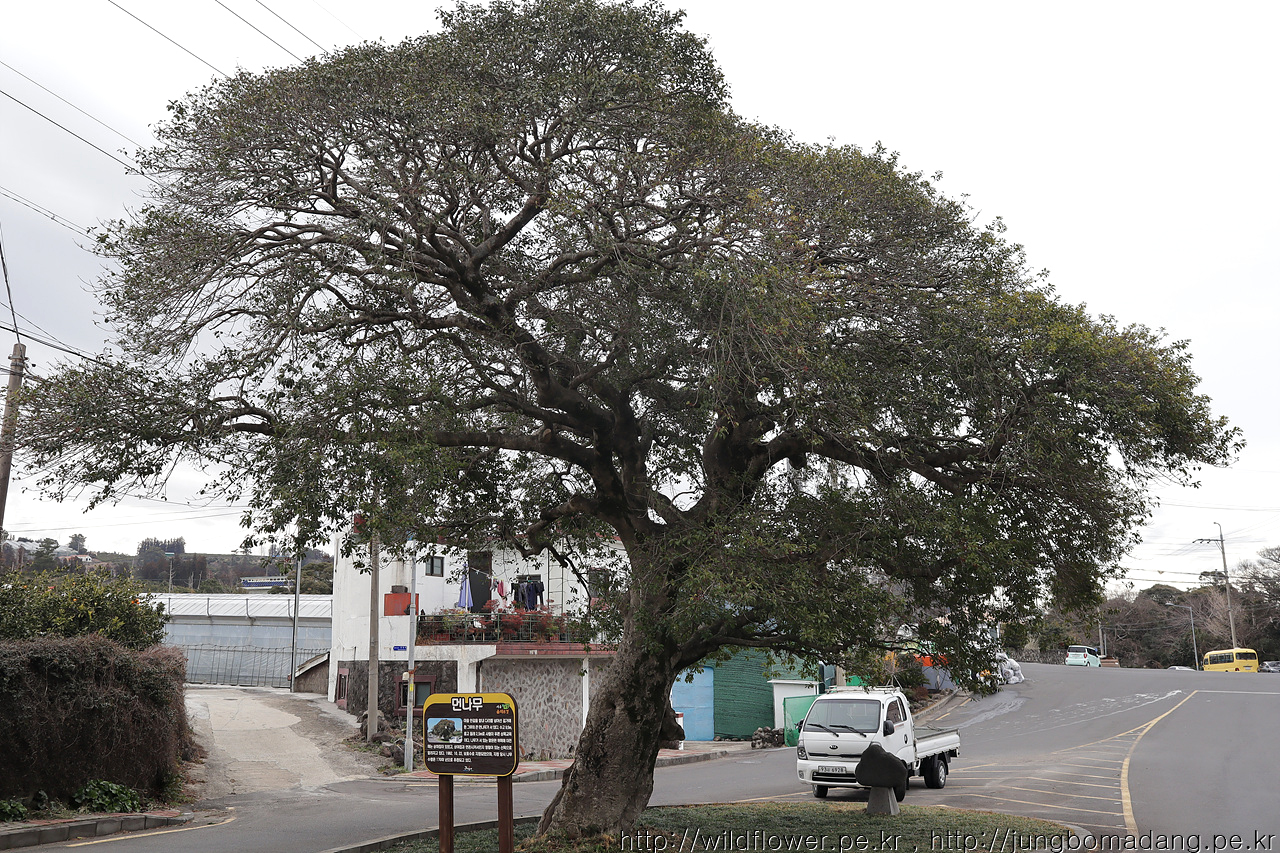 먼나무 - 수령 170년. 주차된 트럭과 비교하면 나무의 크기를 가늠할 수 있습니다.