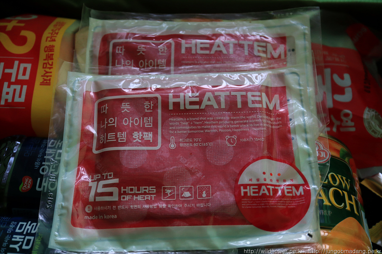핫팩도 3개중에 1개 미리 오픈합니다. 전에 사용하던 군용핫팩 절반 용량이라 주머니 양쪽에 쏙~ 넣으면 딱이네요.