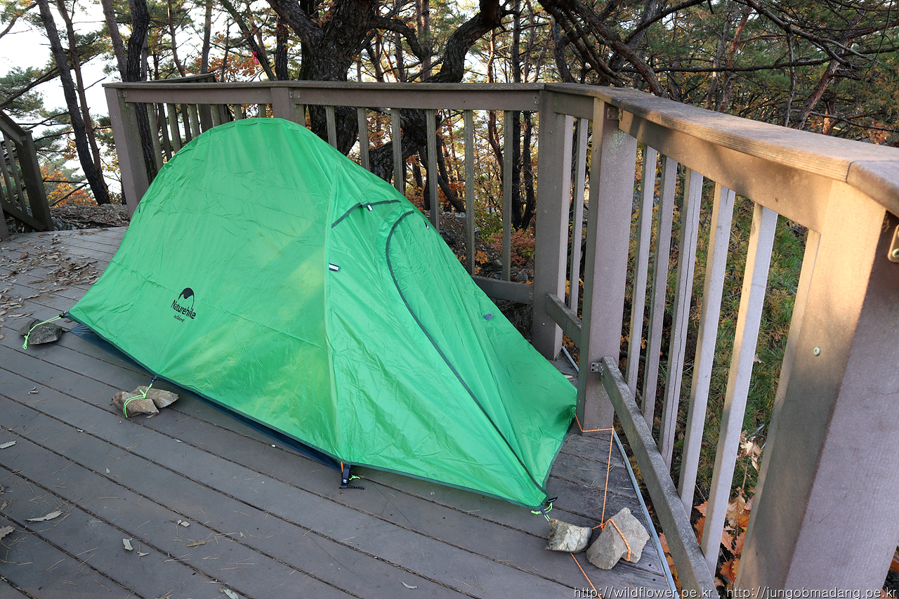 이런 이런 ㅠ 데크팩을 두고 와서 임기웅변으로 그냥 주변에 널리고 널린 돌 주워다가 대충 고정합니다. 1인용 텐트라서 자리 차지도 많이 안하고 주변에 민폐를 최소화할 수 있습니다. 텐트 각을 중요하게 생각하는 분들은 이 상황이면 스트레스 만땅이겠죠. 하지만, 전 이만하면 충분합니다.