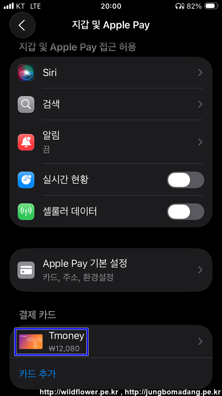 33. 설정 - 지갑 및 Apple Pay 메뉴를 선택하면 하단 결제 카드에서 Tmoney에서 잔액을 확인할 수 있습니다.