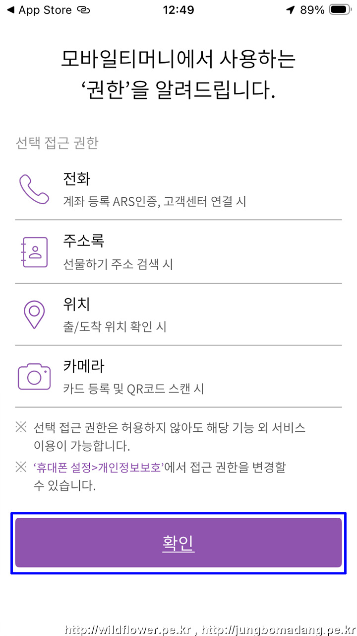4. 모바일티머니가 사용하는 권한에 대한 안내인데 '확인'을 선택하면 됩니다.