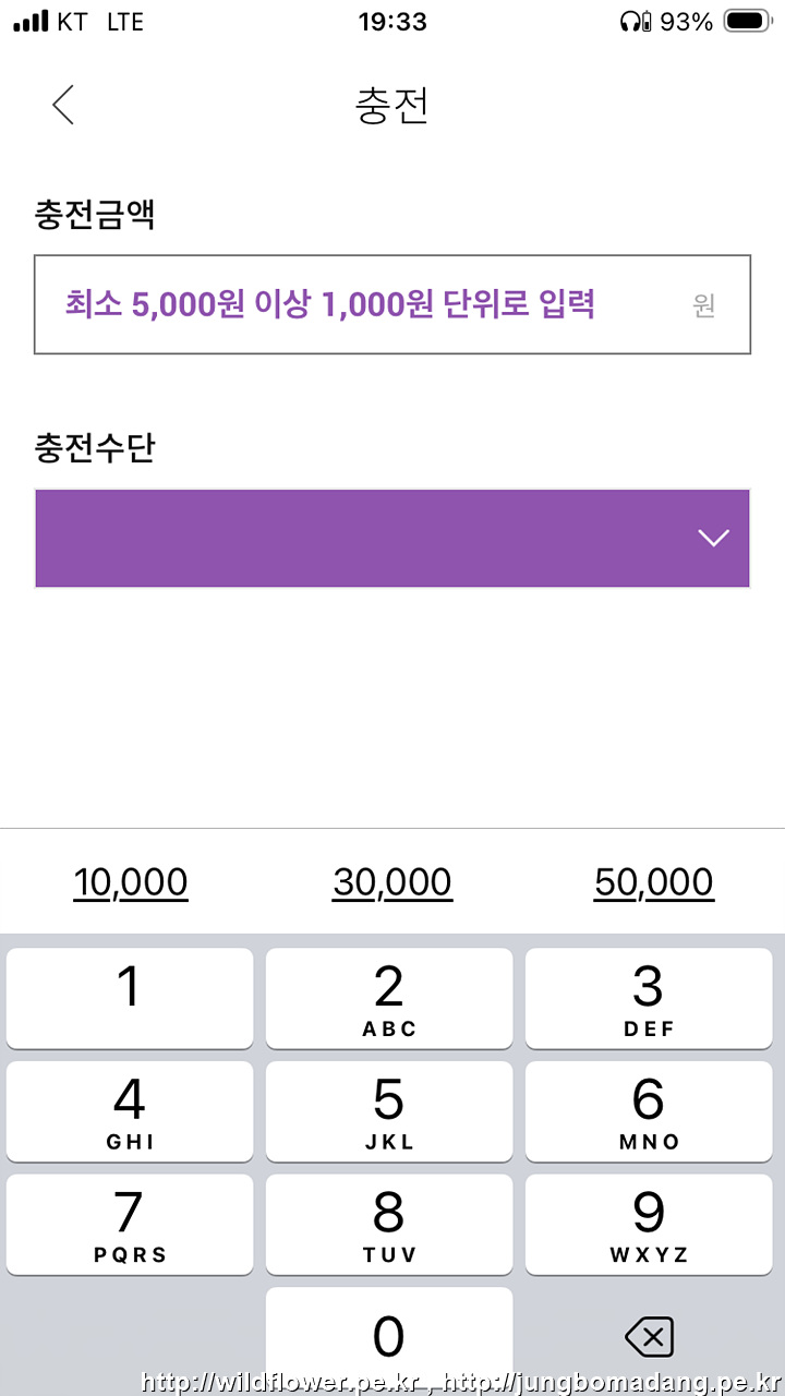 24. 충전을 위해 숫자 패드나 금액 버튼(10000, 30000, 50000)을 눌러서 충전금액을 입력합니다. 충전금액은 1000원 단위로 입력되어야 하고, 5000원부터 충전됩니다. 금액입력이 끝나면 바탕에 흰 부분을 선택(터치)하면 충전 버튼이 보입니다.