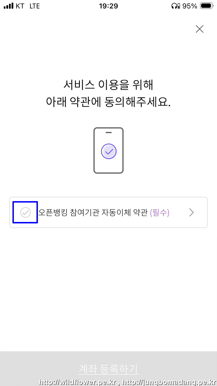 16. 계좌 이용을 위해 동의가 필요합니다. 오픈뱅킹 참여기관 자동이체 약관 앞 'V'를 선택합니다.
