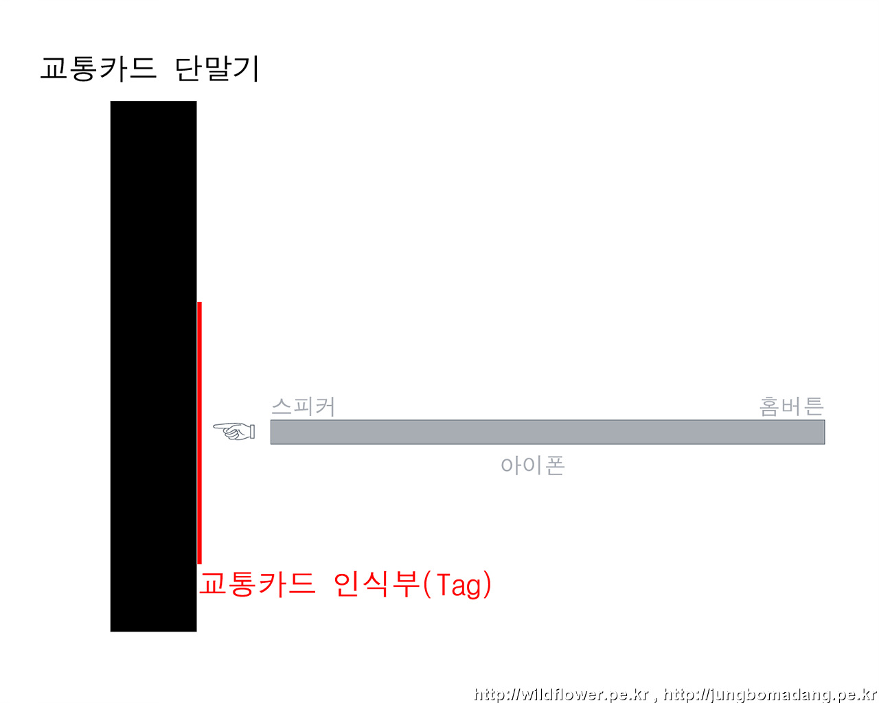 아래 그림은 측면(옆면)에서 바라본 것으로, 교통카드 단말기의 교통카드 인식부에 아이폰이 교통카드 단말기와 90도에 가까이 위치하게끔 아이폰 윗쪽(스피커 있는)을 갖다대면 다른 교통(신용)카드가 있더라도 문제없이 모바일티머니만 결제되는 것을 확인하였습니다. 참고하시길 바랍니다.