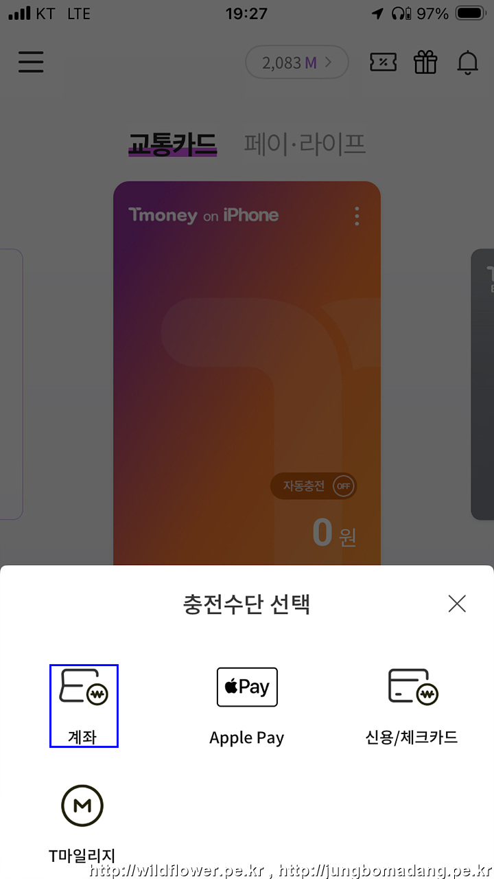 아이폰에서 모바일티머니 교통카드를 사용하는 방법(설치, 충전(계좌,T마일리지))을 설명합니다.